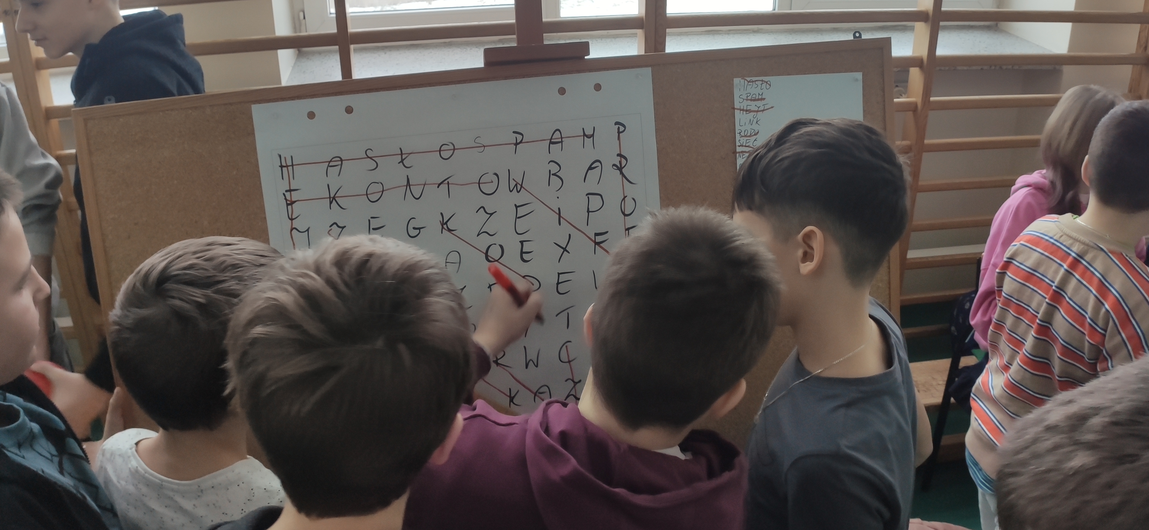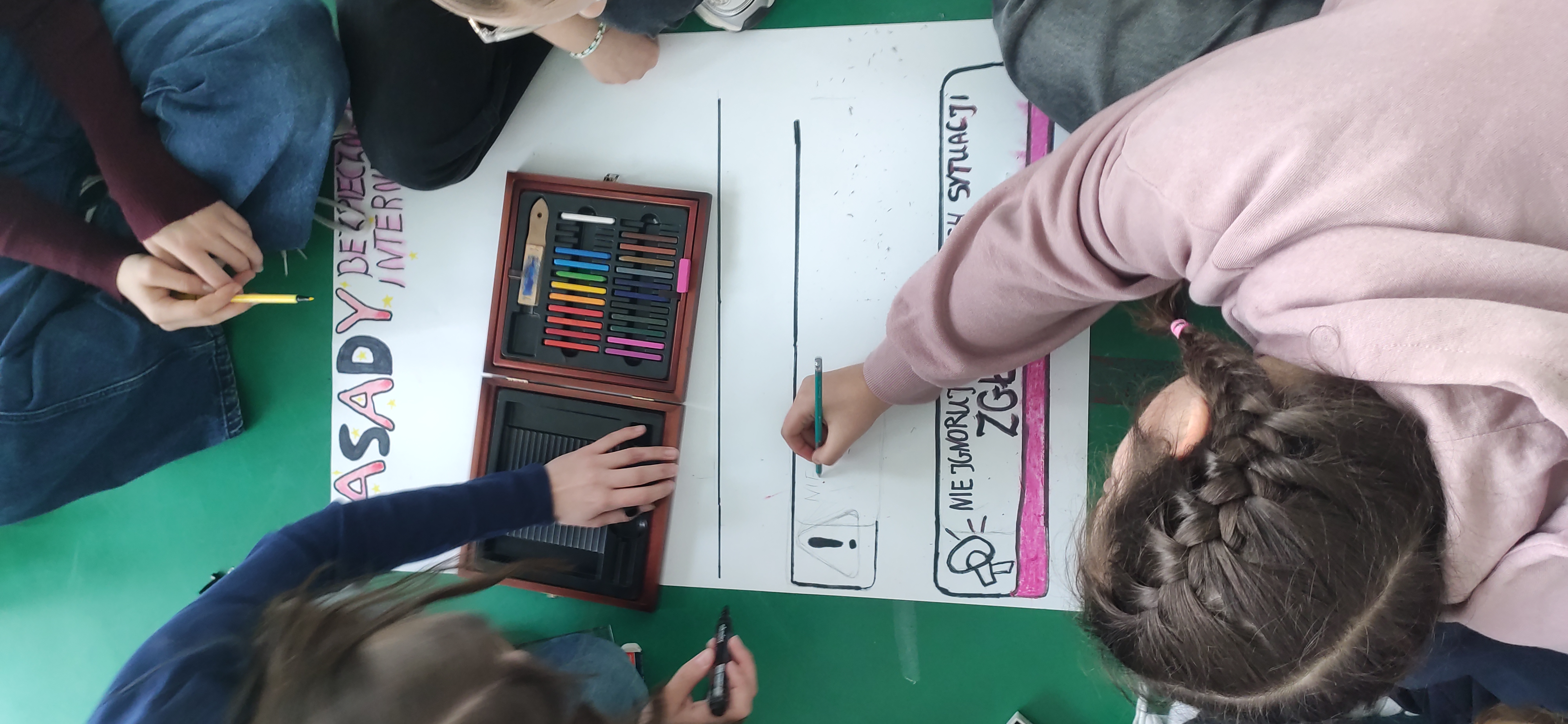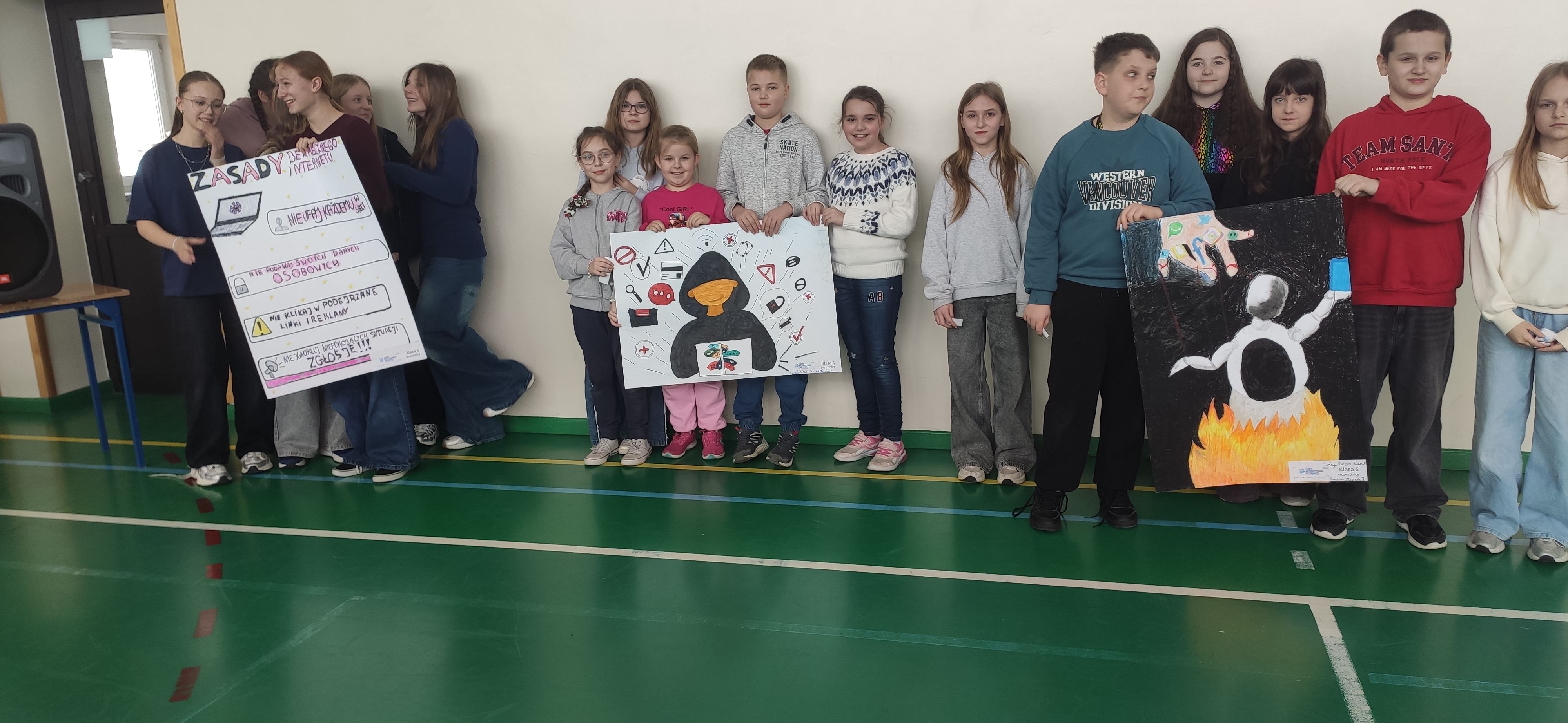 Uczymy się najchętniej w formie zabawy z elementami rywalizacji. Pamiętając o tej zasadzie uczniowie klasy 8 przygotowali dla klas IV - VII stacje zadaniowe o tematyce bezpieczenstwa w internecie. Uczniowie podzieleni na grupy zdobywali punkty ucząc się mimochodem. Podczas akcji powstaly również wysokiej jakości plakaty, ktore można podziwiać na korytarzu naszej szkoły.