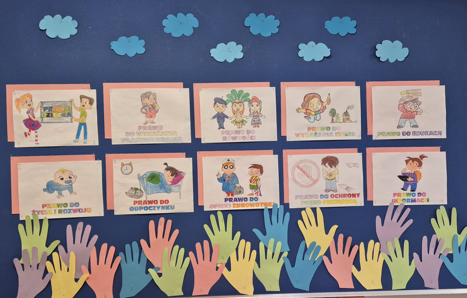 Następnie uczniowie uczestniczyli w różnorodnych aktywnościach plastycznych. Przygotowali plakaty i kolorowanki, dzięki którym mogli wyrazić swoje przemyślenia na temat poszczególnych praw. Powstały też hasła i slogany przypominające o wartościach, jakie powinny towarzyszyć młodym ludziom w ich codziennym życiu. Prace uczniów ozdobiły szkolne korytarze, tworząc przyjazną przestrzeń pełną mądrych i inspirujących myśli.