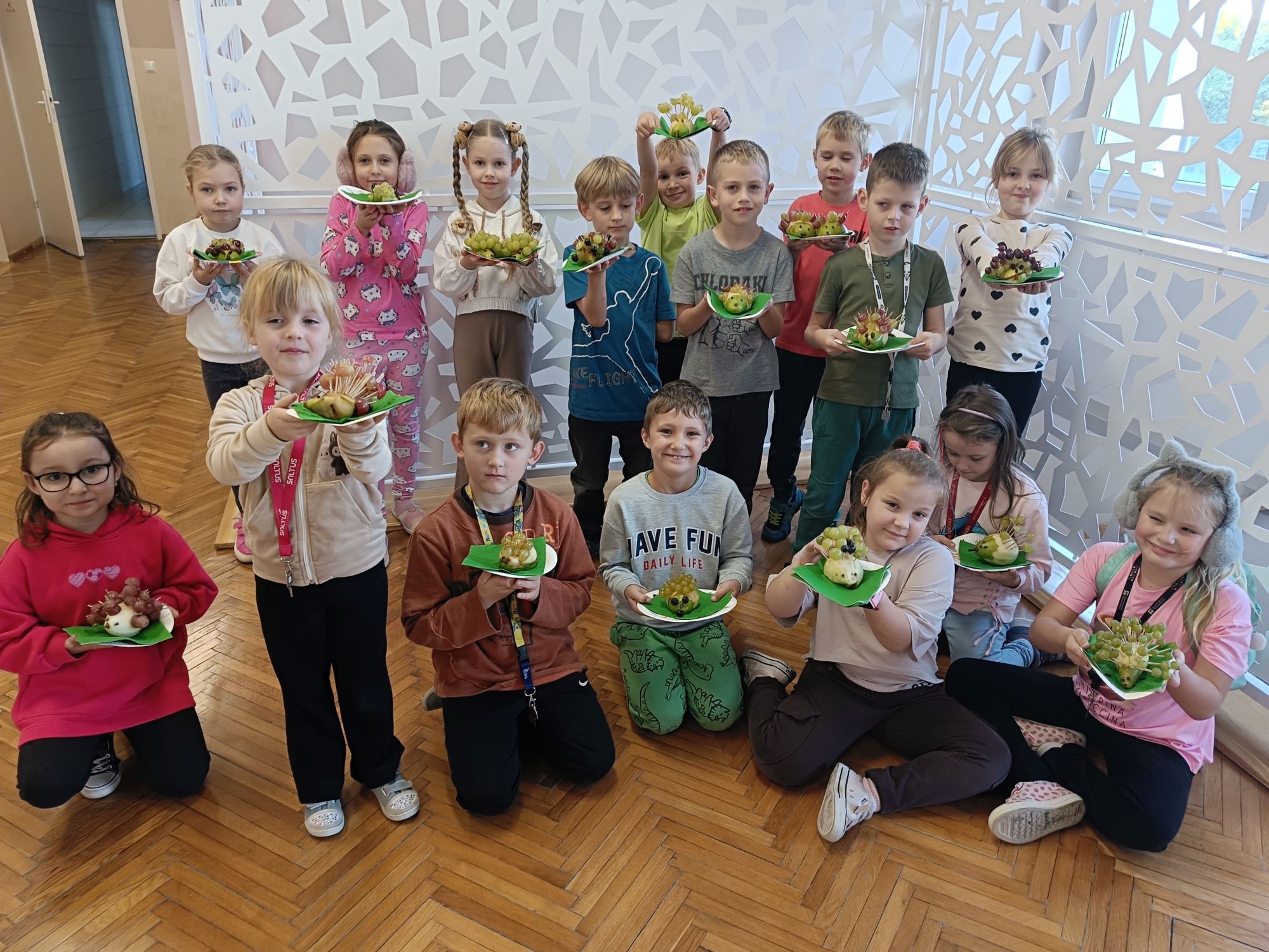 W październiku i listopadzie klasa pierwsza uczestniczyła w zajęciach w ramach programu koordynowanego przez Krajowy Ośrodek Wsparcia Rolnictwa „Owoce i warzywa oraz mleko w szkole”. Głównym celem tego programu jest kształtowanie prawidłowych nawyków żywieniowych poprzez dostarczanie uczniom produktów mlecznych oraz owocowo-warzywnych. Program obejmuje działania o charakterze edukacyjnym i promocyjnym. W naszej klasie odbyły się zajęcia edukacyjne mające na celu utrwalenie przez dzieci nazw owoców i warzyw, poznanie ich walorów smakowych i wartości zdrowotnych. Dzieci obejrzały film na temat znaczenia witamin obecnych w warzywach i owocach dla prawidłowego funkcjonowania organizmu człowieka. Wykonały również prace plastyczne oraz przygotowały pyszne i piękne owocowe jeżyki. W listopadzie wzięły udział w "Witaminowym koncercie", podczas którego poprzez świetną zabawę utrwaliły prawidłowe nawyki żywieniowe.