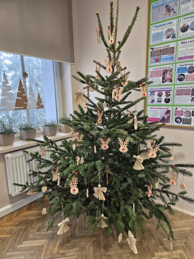 Na gałązkach zawisły imienne, ekologiczne ozdoby w kształcie reniferków oraz świątecznych motywów, wykonane z dbałością o środowisko. Drzewko uzupełniają niezwykłe aniołki stworzone przez samych uczniów – powstały one z książek przeznaczonych do utylizacji, którym dzięki pomysłowości dzieci nadano drugie życie.