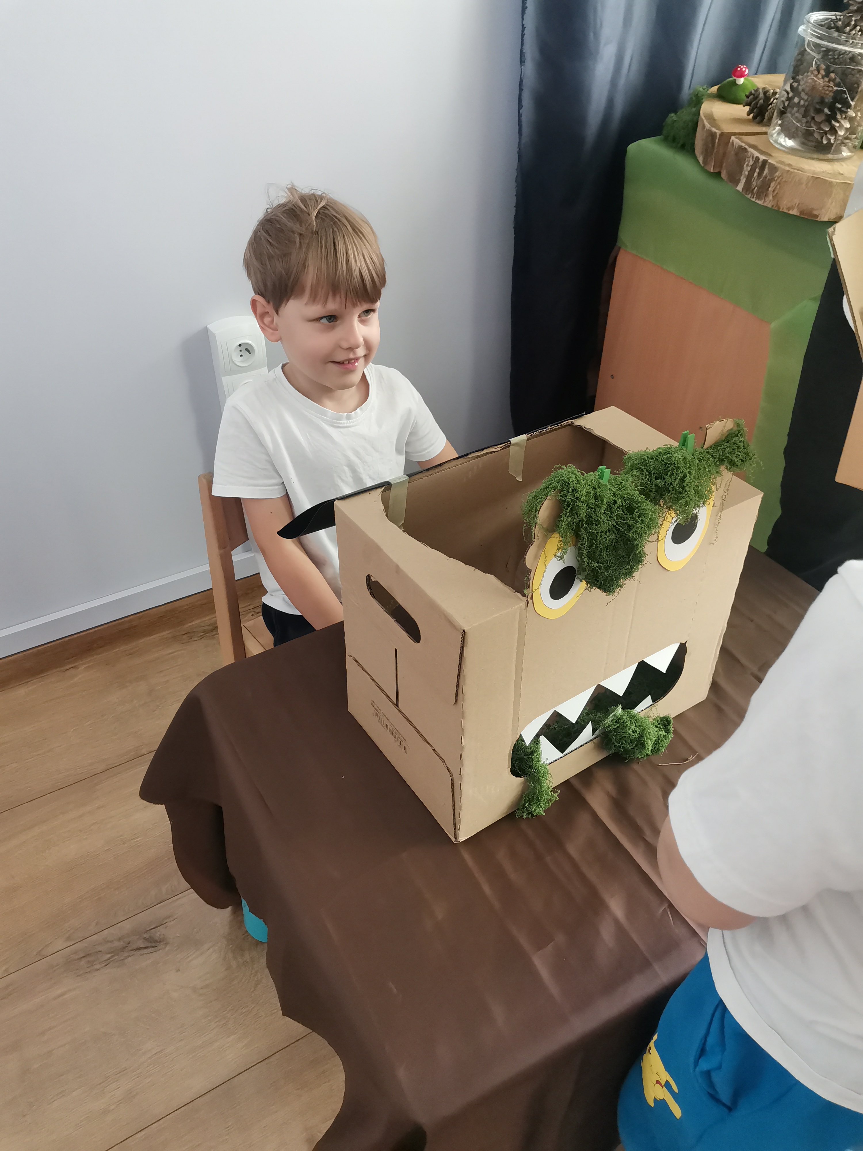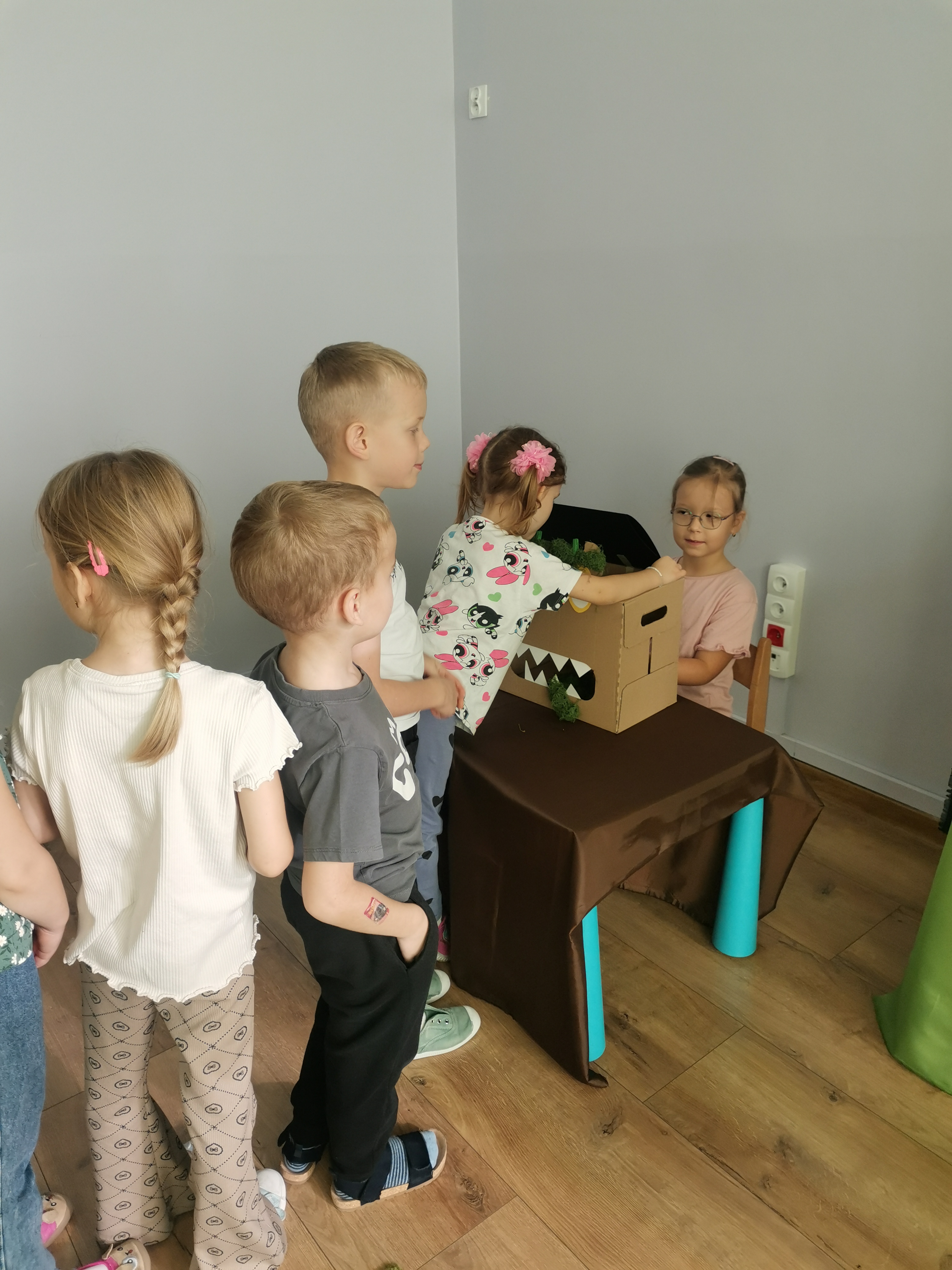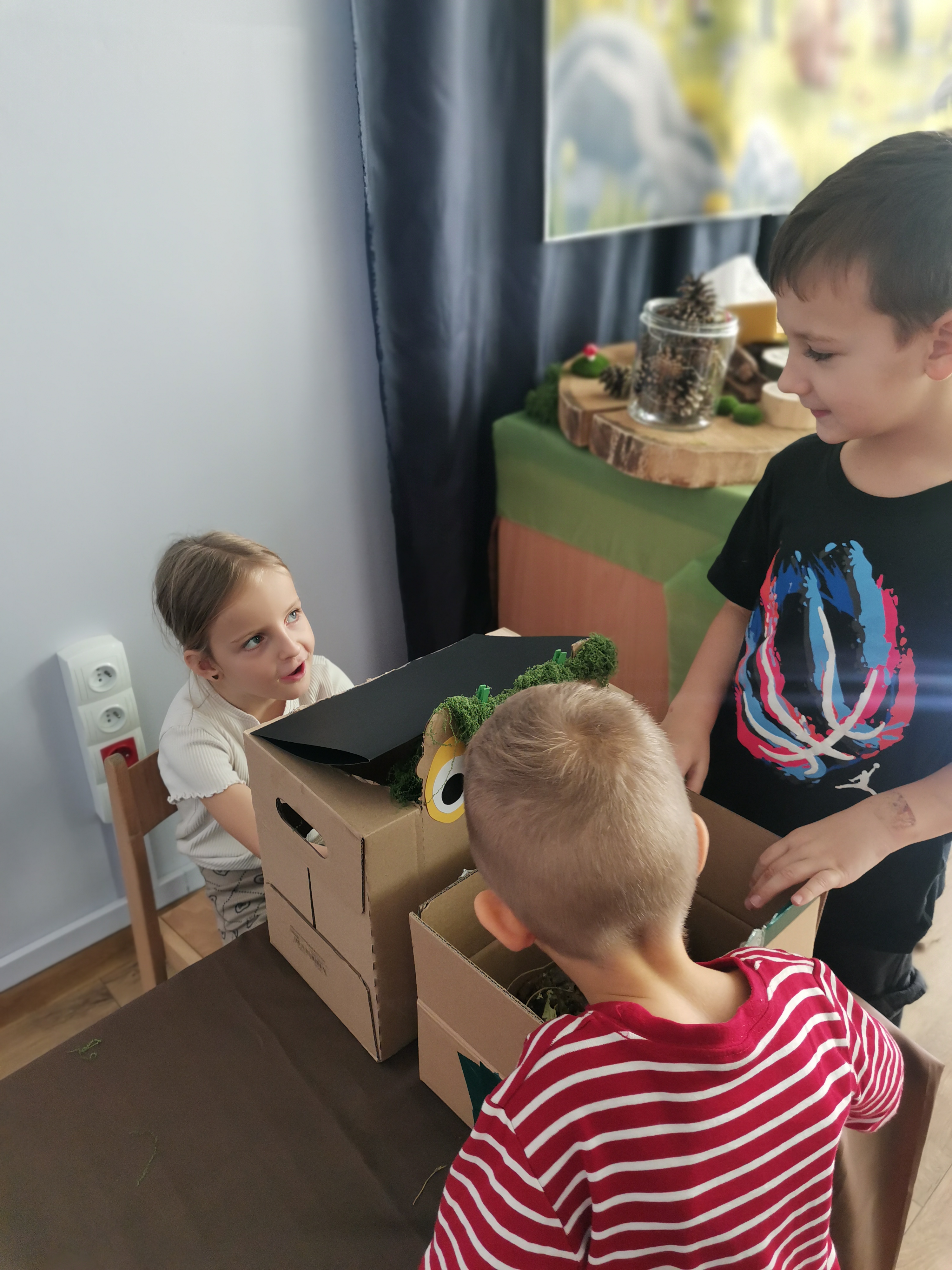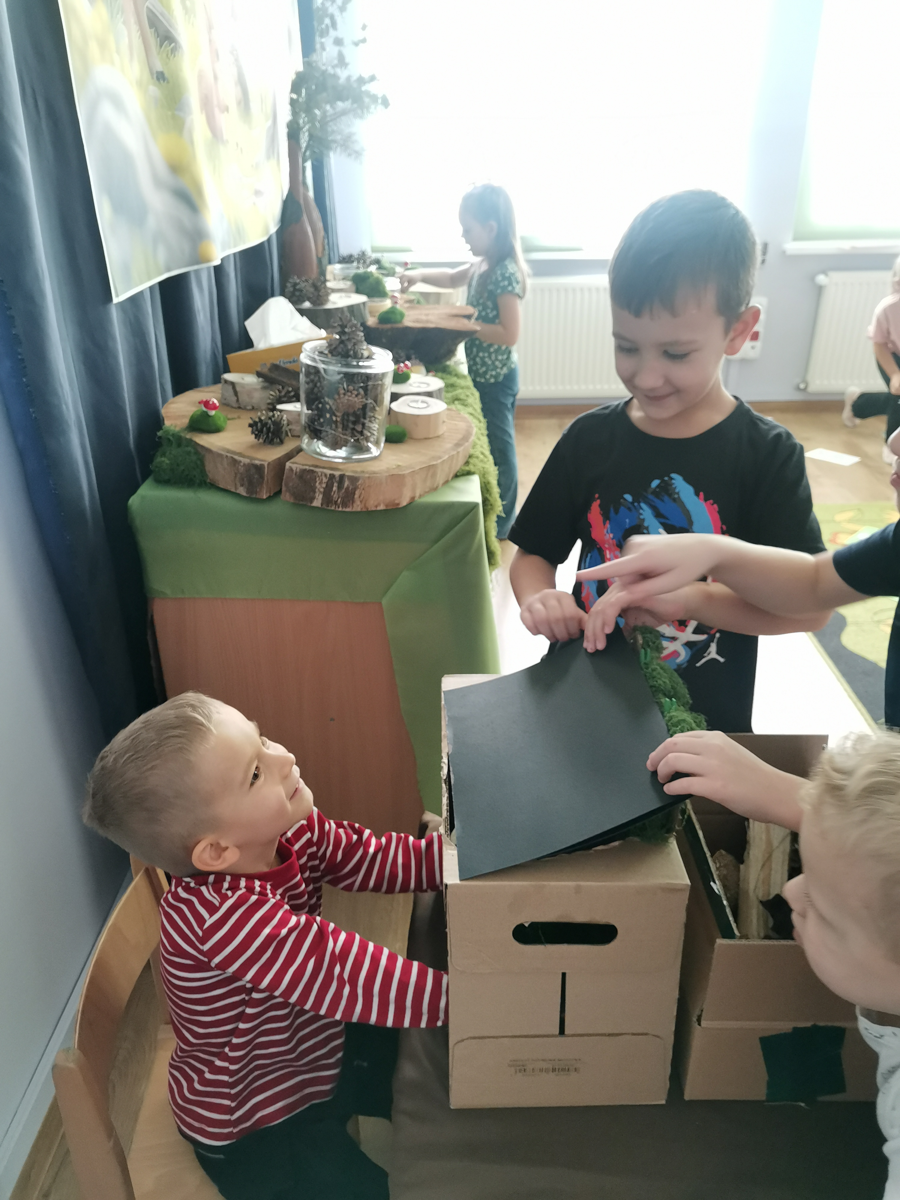 Kontynuując zajęcia związane z darami lasu, zorganizowaliśmy leśną "Zgaduj - zgadulę". Dzieci za pomocą zmysłu dotyku odgadywały nazwy leśnych skarbów. Kolejka do zgaduj- zgaduli była długa i przepełniona ciekawością i entuzjazmem.